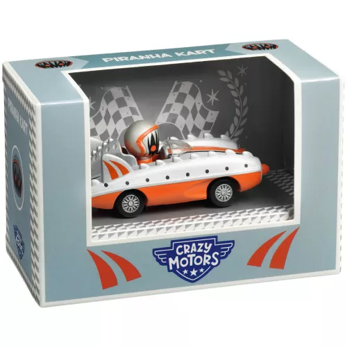 Deze rijkelijk gedecoreerde raceauto ‘Piranha Kart’ van het Franse merk Djeco haalt met gemak alle andere speelgoedauto’s in. Deze snelheidsduivel laat hoofden draaien wanneer hij voorbij rijdt.