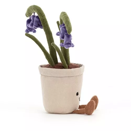 ‘Amuseable Bluebell’ van het Engelse merk Jellycat is een fleurige knuffelbloem in een canvas potje. Met de vertederende glimlach, corduroy beentjes en zwarte kraaloogjes is het haast onmogelijk om niet verliefd te worden op dit knuffelbolgewas. Uit de bruine, pluche aarde steken vijf groene, corduroy stengels, waarvan er twee zijn versierd met paarse klokjes.