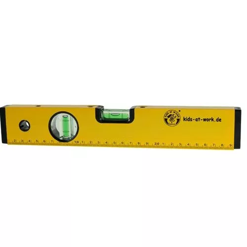 Een échte aluminium waterpas uit de serie Kids-at-Work van het Duitse merk Corvus. Een waterpas blijft fascinerend voor kinderen hoe dat werkt! Is een oppervlak exact horizontaal, dan ligt de luchtbel tussen de streepjes.
