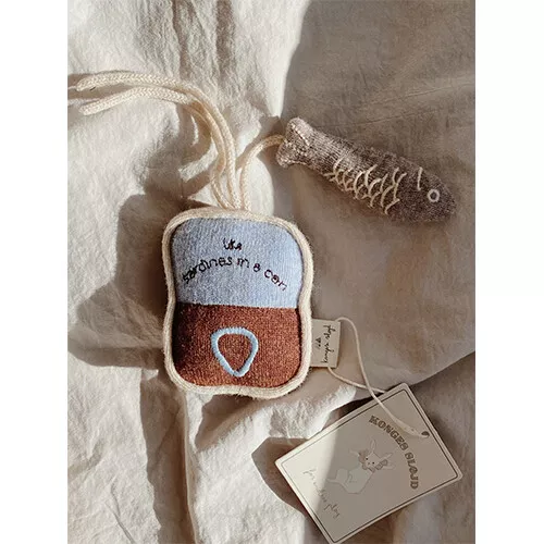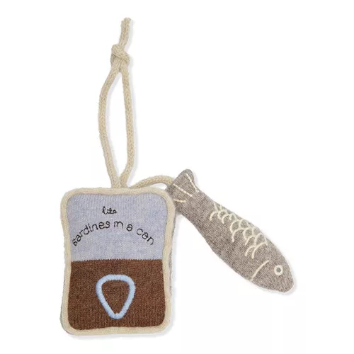 ‘Activity Toy Sardines’ van het Deense merk Konges Sløjd is een vrolijk activiteitenspeeltje met een vriendelijk belletje, als erop gedrukt wordt.