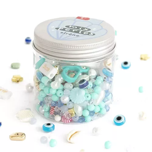 Maak kleurrijke sieraden en accessoires met de ‘Sirène’ kralen van het Franse merk La Petite Épicerie. De knutselset bestaat uit kralen in zeeblauwe en -groene tinten, parels en schelpen.