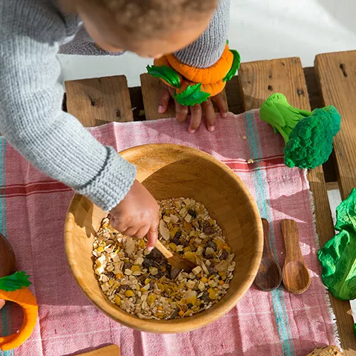 Het babyspeeltje is handgemaakt van pure rubber van de Hevea boom, is ecologisch en geheel biologisch afbreekbaar. Natuurrubber is 100% veilig om op te sabbelen en te kauwen. Het speelgoed is gekleurd met plantaardige kleurstoffen.